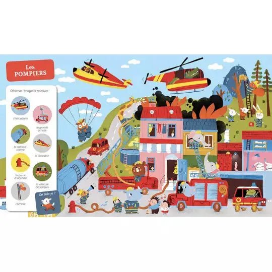 Sur chaque double page, l’enfant découvre un nouvel univers autour du thème des véhicules et doit retrouver 7 éléments bien visibles