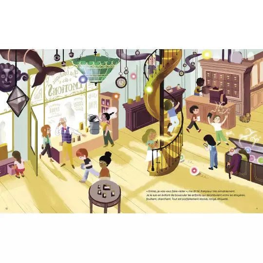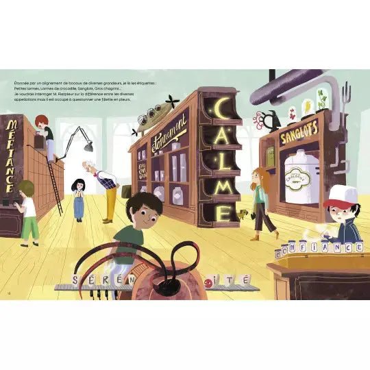 Sur les étagères, on trouve des bocaux à chagrins, un tourniquet rempli de gros mots, une malle pour les cauchemars, une boîte à rires… Chacun peut y déposer ce qui le pèse ou y piocher ce dont il a besoin. Un livre poétique et bienveillant, à la fois ludique et profond, pour parler des émotions avec délicatesse et humour.