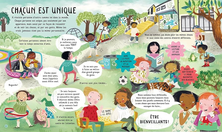 Cet album aborde avec douceur et exactitude la richesse de la diversité : qu’il s’agisse de familles homoparentales ou recomposées, de handicaps ou de différences neurologiques, d’origines variées ou d’identités de genre, il montre que chacun a sa place. Rédigé avec bienveillance et sans ton moralisateur, il encourage les enfants à reconnaître que la différence rend la vie plus riche et que chaque personne est précieuse.